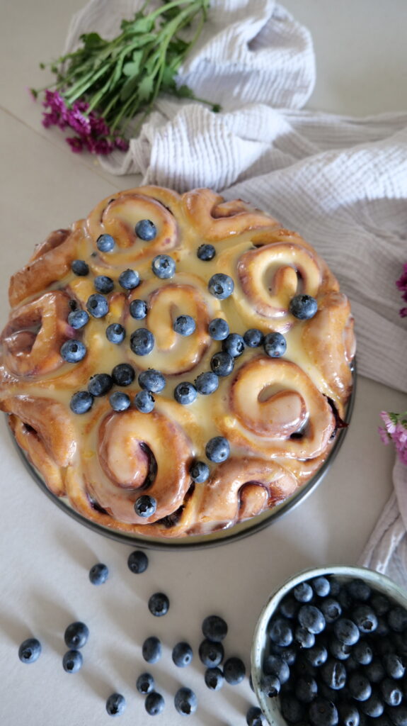 Unseren soften Quarkhefeteig haben wir mit jede Menge Blaubeeren gefüllt und nach dem Backen mit einer Orangenglasur überzogen. So mega lecker, den müsst ihr unbedingt probieren!